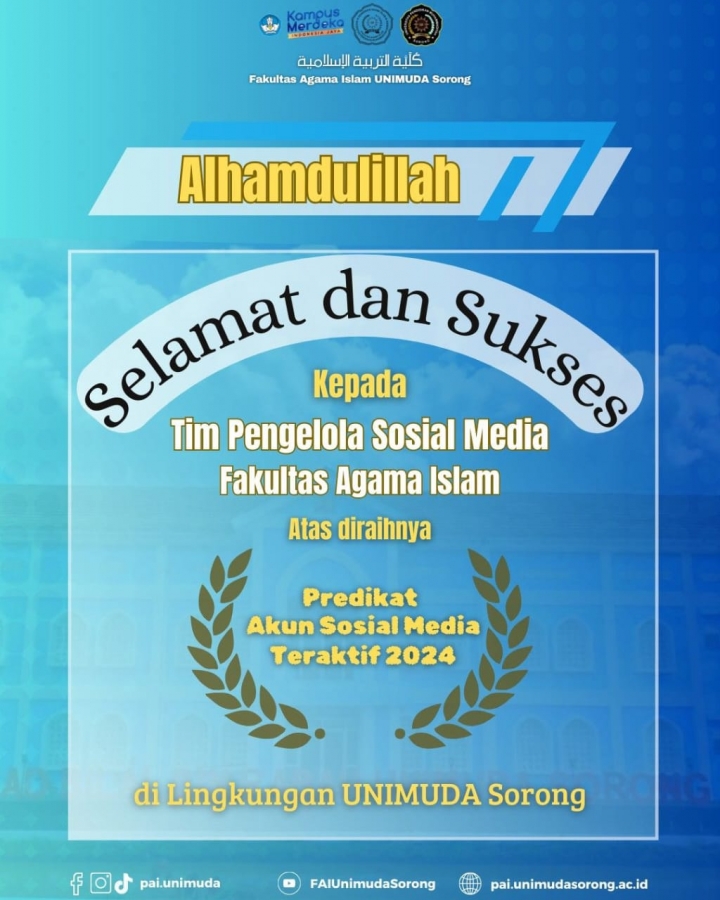 Segala puji bagi Allah SWT yang telah melimpahkan rahmat dan karunia-Nya. Dengan penuh rasa syukur, kami mengucapkan selamat kepada Tim Pengelola Media Sosial Fakultas Agama Islam UNIMUDA Sorong atas pencapaian yang membanggakan, yakni meraih predikat Akun Media Sosial Teraktif Tahun 2024 di lingkungan UNIMUDA Sorong.