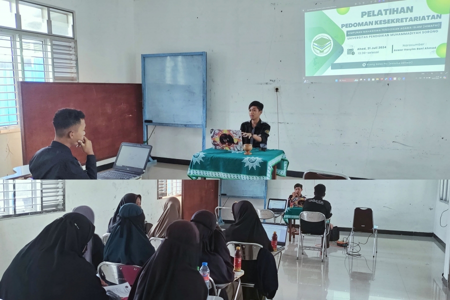 Sorong, 21 Juli 2024. Mahasiswa Program Studi Pendidikan Agama Islam (PAI) Universitas Pendidikan Muhammadiyah Sorong Mengikuti Pelatihan Kesekretariatan, yang mana dalam pelatihan tersebut membahas Tentang tatacara pembuatan surat, Proposal Dana dan Laporan Pertanggung Jawaban. Kegiatan pelatihan tersebut dilaksanakan di gedung Ma'had Bilal bin Rabah pada pukul 13:30 - Selesai, Adapun Narasumber pada kegiatan pelatihan tersebut adalah saudara (Aswar Hasyim Bani Ahmad) selaku Sekertaris Umum Himpunan Mahasiswa Pendidikan Agama Islam (HIMAPAI) priode 2024-2025