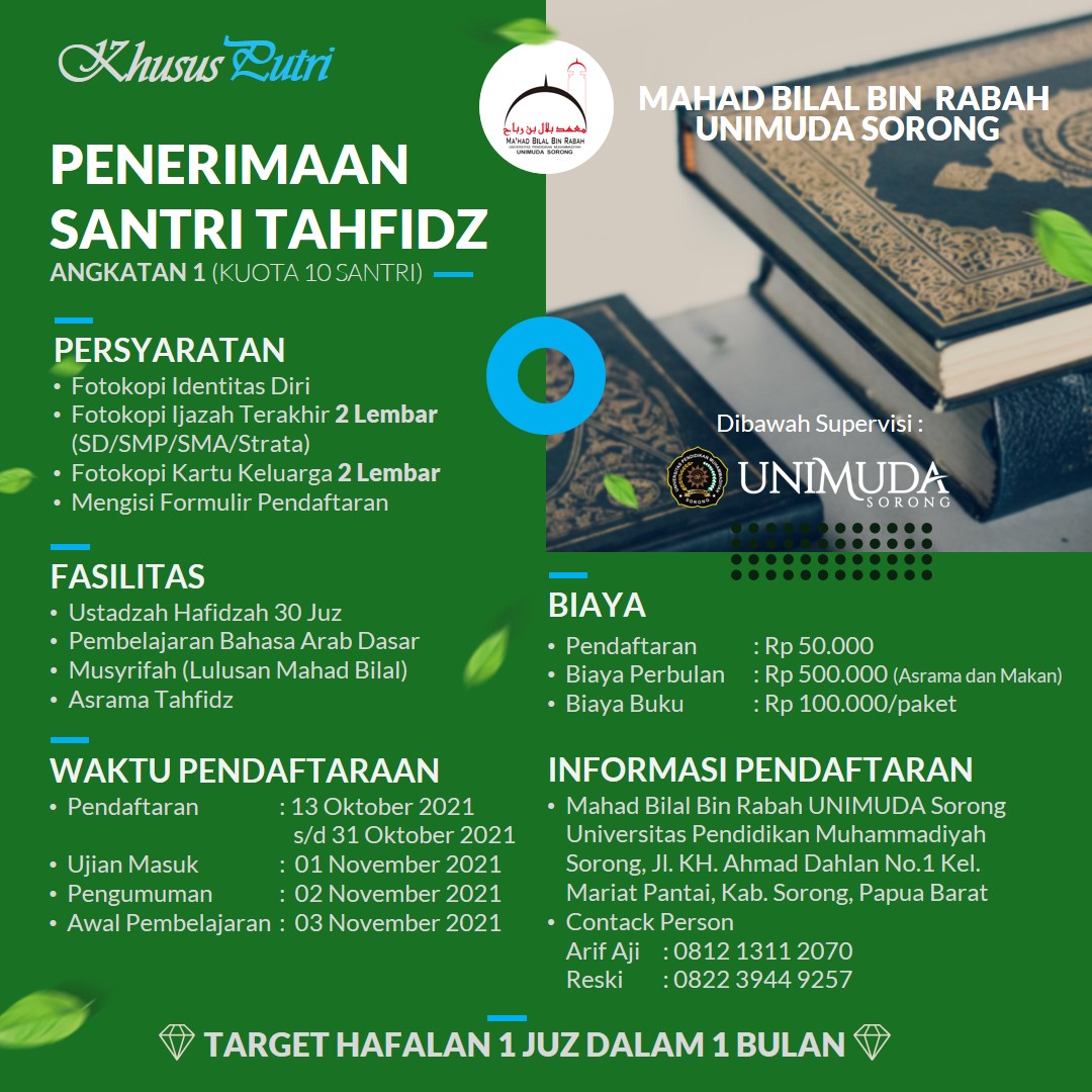 AIMAS, KAB.SORONG - Tahfidzul Qur'an Bilal Bin Rabah Muhammadiyah Sorong membuka penerimaan khusus santri putri untuk pertama kalinya dengan kuota 10 santri. Tahfidzul Qur'an Bilal Bin Rabah Muhammadiyah Sorong merupakan program unggulan dari MTs. Muhammadiyah Dua Aimas yang bekerja sama dengan Lembaga Bahasa Arab dan Studi Islam Ma'had Bilal Bin Rabah UNIMUDA Sorong.