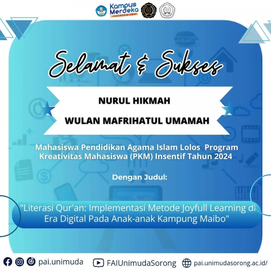Selamat dan sukses untuk 2 mahasiswa Program Studi Pendidikan Agama Islam yang telah lolos pendanaan PKM AI dengan judul “Literasi Quran : Implementasi Metode Joyfull Learning di Era Digital Pada Anak-anak Kampung Maibo”. #unimudaunimudasorong#fai.unimuda#pai.unimuda#himapai#mahadbilalbinrabah __________ Ikuti setiap perkembangan kami dengan cara memfollow akun social media berikut : Facebook : pai.unimuda Instagram : @pai.unimuda Website : pai.unimudasorong.ac.id/